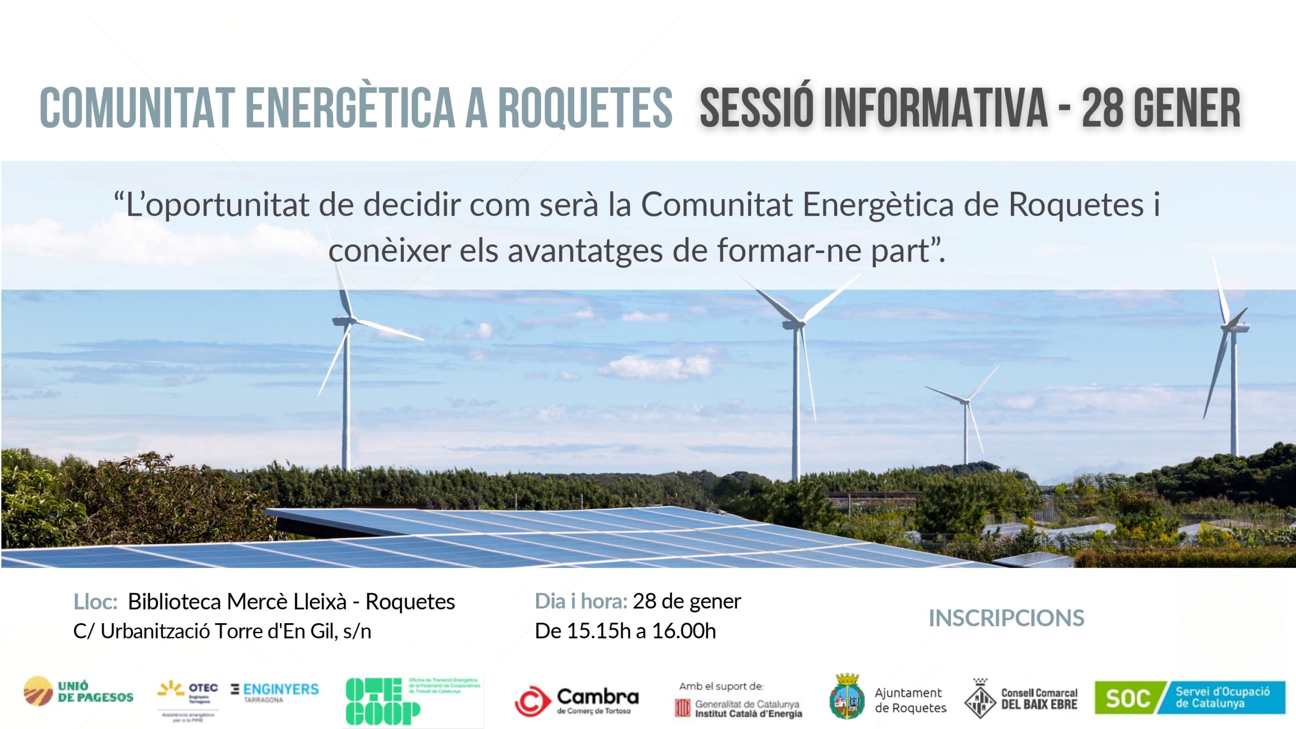 “L’oportunitat de decidir com serà la Comunitat Energètica de Roquetes i conèixer els avantatges de formar-ne part”.